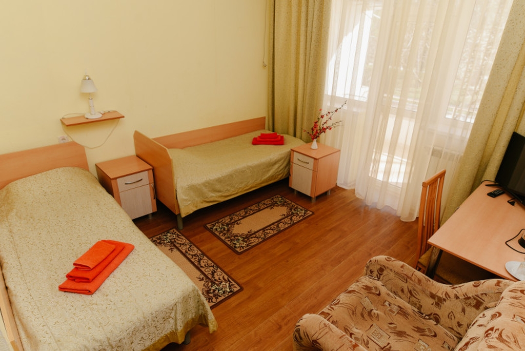 В номере: две односпальные кровати, прикроватные тумбочки, шкаф для одежды, туалетный столик, ТВ, ХОЛ, КОНД, санузел, балкон.