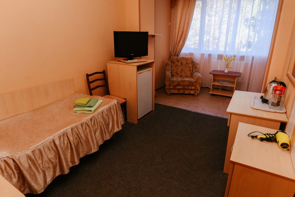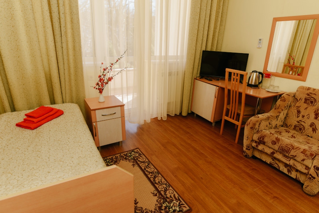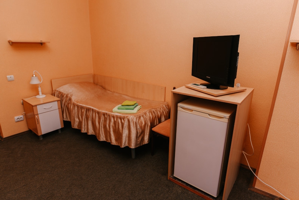 В номере: односпальная кровать, балкон, письменный стол, зеркало, шкаф для одежды, прикроватная тумбочка, настольная лампа, ТВ, КОНД, ХОЛ. Туалет и душевая рассчитаны на использование постояльцами двух смежных номеров.