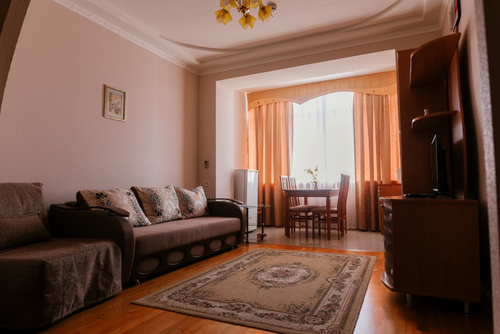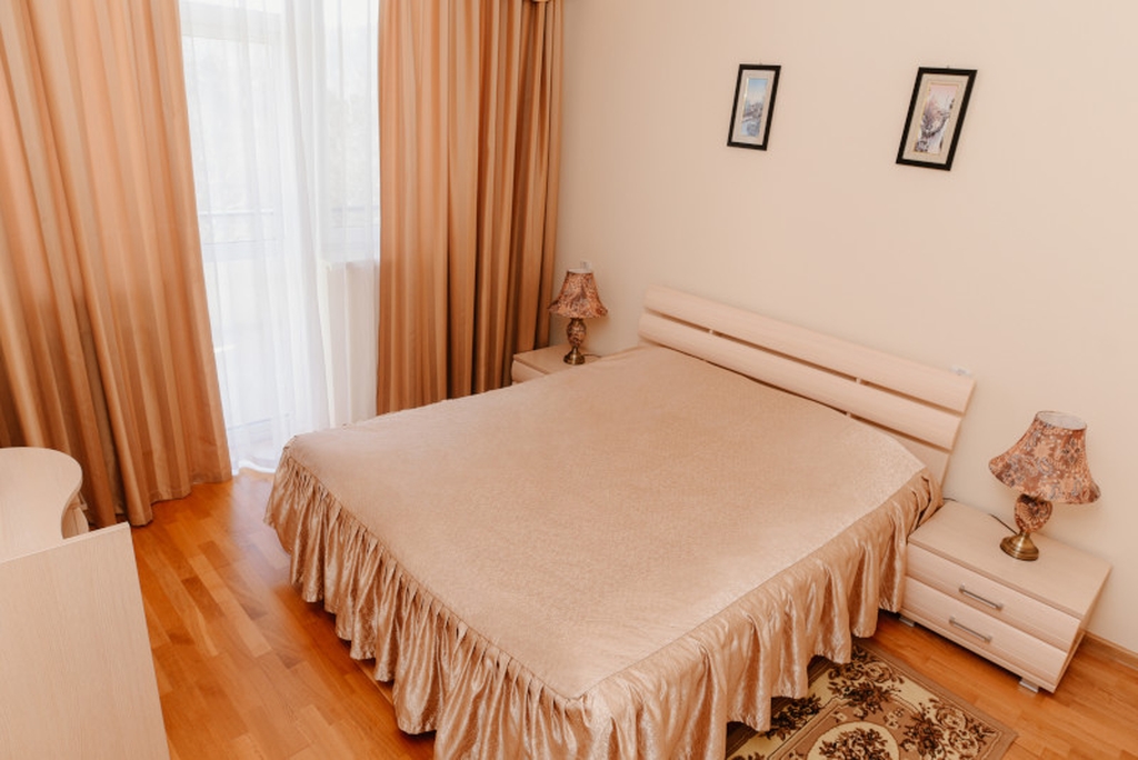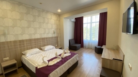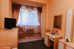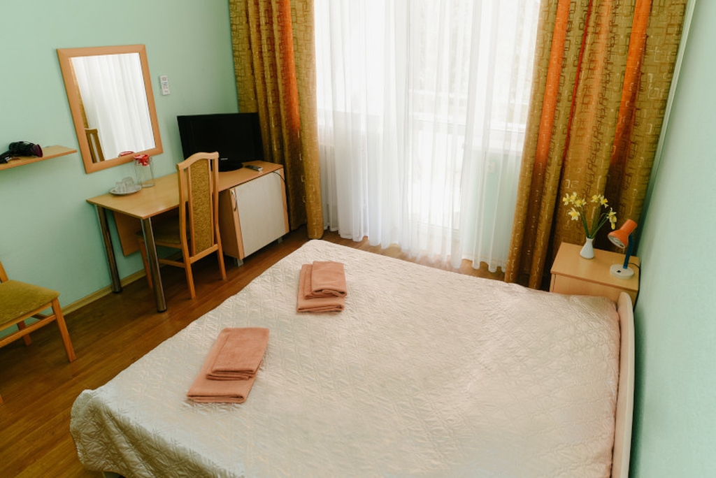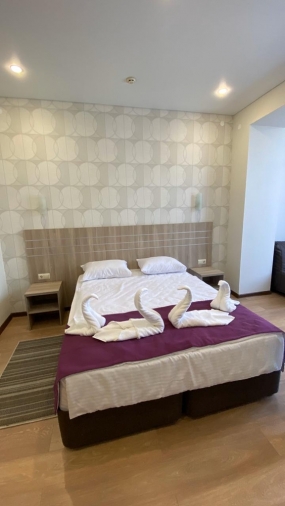 В номере: двухспальная кровать, шкаф для одежды, зеркало, туалетный столик, ХОЛ, ТВ, КОНД, прикроватная тумбочка, санузел, чайная мини-зона.