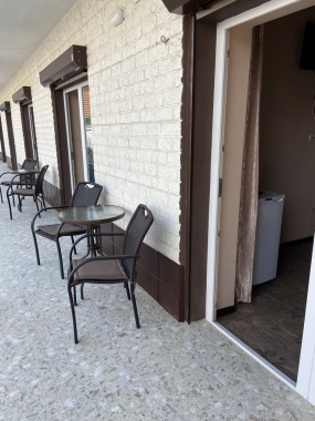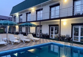 находится в городе Саки, напротив базы отдыха «Прибой». Территория закрытая, ухоженная, есть бассейн. Также отдыхающие гостевого дома пользуются инфраструктурой «Прибоя», где есть все для полноценного отдыха. Рядом - остановка общественного транспорта, за 10 минут можно доехать до аквапарка или центра города, за 20 минут – до центра Евпатории. Недалеко от гостиницы находится известное грязевое озеро, здесь можно вдоволь измазаться грязью и проверить ее целебную силу.